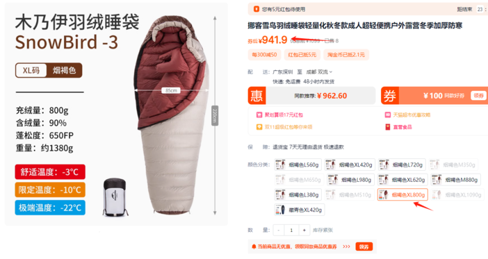 《清仓》-3度,XL,填充800客挪客雪鸟,原价1099,特价798包邮